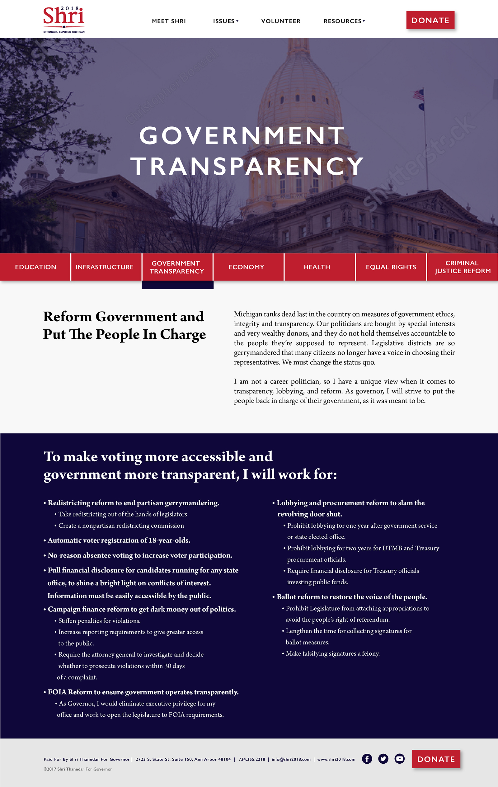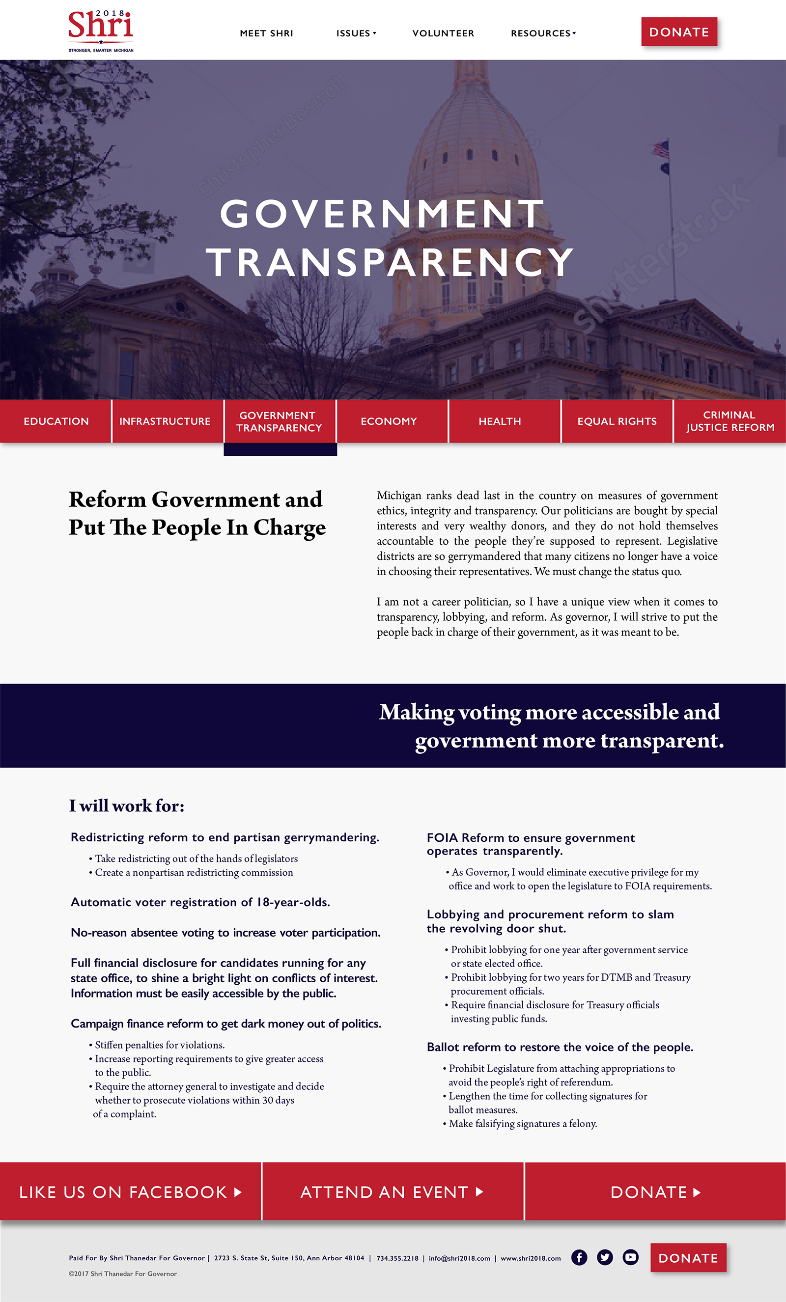 This website supported Michigan gubernatorial candidate Shri Thanedar during the 2016 election, highlighting his political ideology and upcoming events. Front end web design and collaboration with web developers.